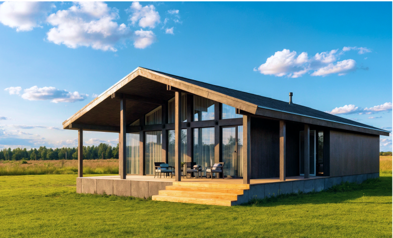 Основная специализация — строительство современных каркасных домов в скандинавском стиле с панорамными окнами.