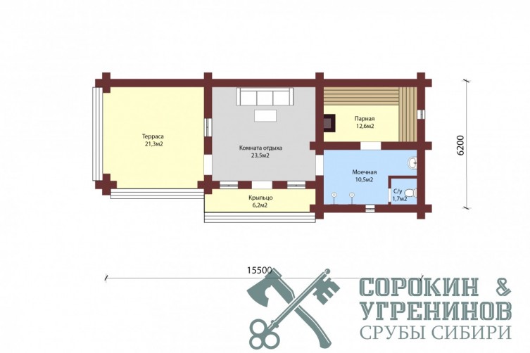 Сруб бани рубленый из бревна кедра диаметра 360мм площадью 75,8м2. Размер сруба 6,2х15,5 метров по осям. Баня имеет большую террасу, парная и мойка раздельные, есть комната отдыха и санузел. Сруб рубленый вручную в русскую чашу (охлоп), брёвна окоренные гидро-окоркой (водой под высоким давлением), а так, же это можно сделать скобелем или лопатой, или строганное рубанком. Объем бревна в срубе 92м3.